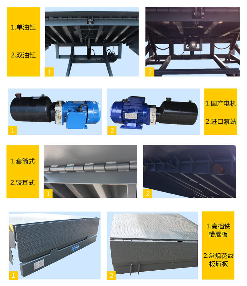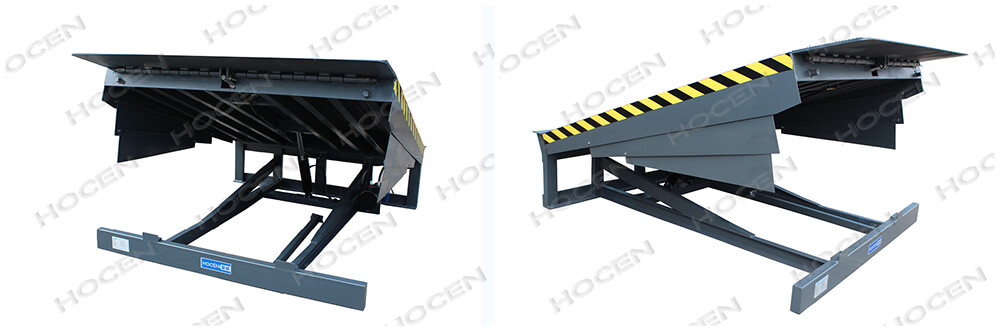 是与仓储月台一起的装卸辅助设备,本设备与月台一体,可根据货车车厢不同高度调节即可调高也可调低,方便叉车驶入车厢,设备采用进口液压泵站,两侧设有防轧裙板,提高工作效率。