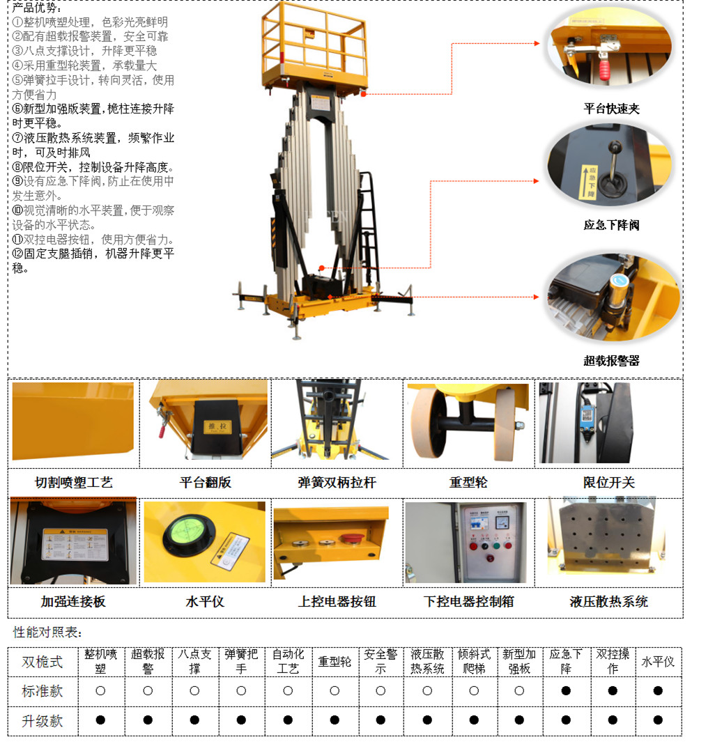 升级款双桅式升降平台采用强度高质优铝合金材料,整机全部喷塑处理,色彩光亮鲜明;配有超载装置,可靠;弹簧把手设计,转向灵活,使用方便省力;特制八点支撑设计,升降平稳自如。方便装卸广泛用于工厂、宾馆、餐厅、车站、机场影剧院、展览馆等场所,是保养机具、油漆装修、调换灯具、电器、清洁保养等用途的伴侣。