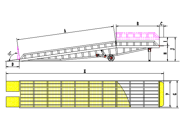 | 型号 | 额定载荷(kg) | A (m) 斜坡长度 | B (m) 平台长度 | C (m) 唇板长度 | D (m) 引板长度 | E (m) 总长度 | F (m) 净宽度 | G (m) 总宽度 | H (m) 最低高度 | I (m) 可调高度 | J (m) 最高高度 |