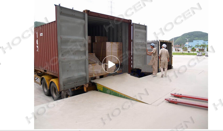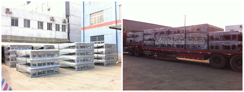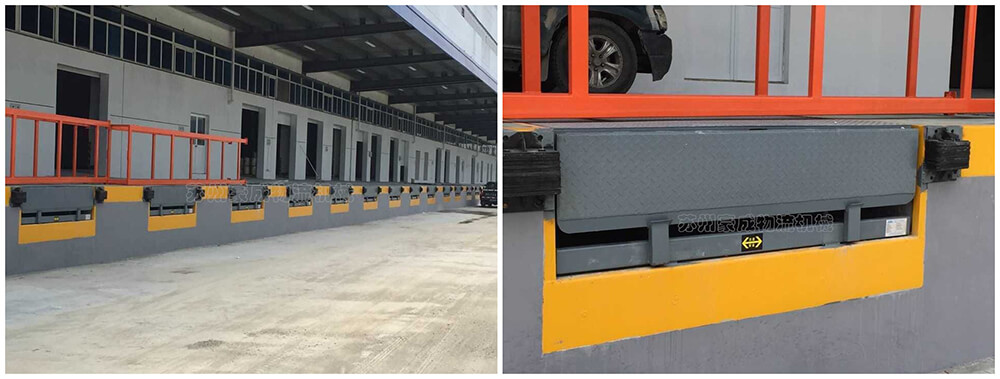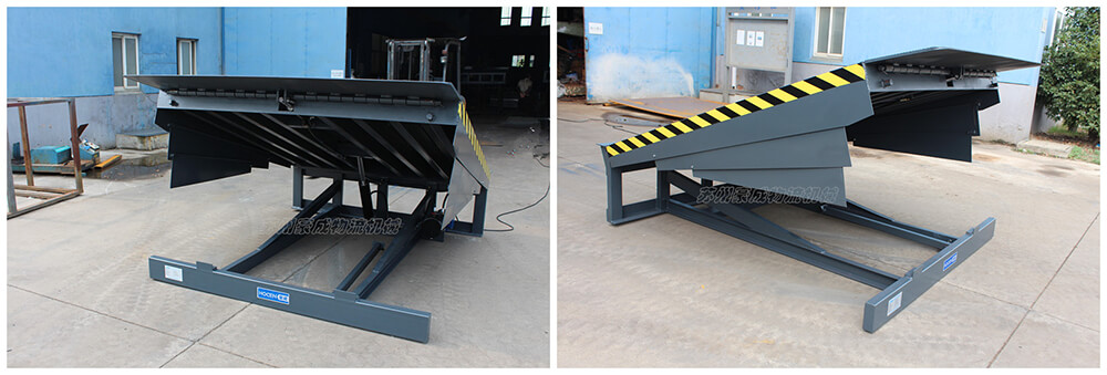 是与仓储月台一起的装卸辅助设备,本设备与月台一体,可根据货车车厢不同高度调节即可调高也可调低,方便叉车驶入车厢,设备采用进口液压泵站,两侧设有防轧裙板,提高工作效率。